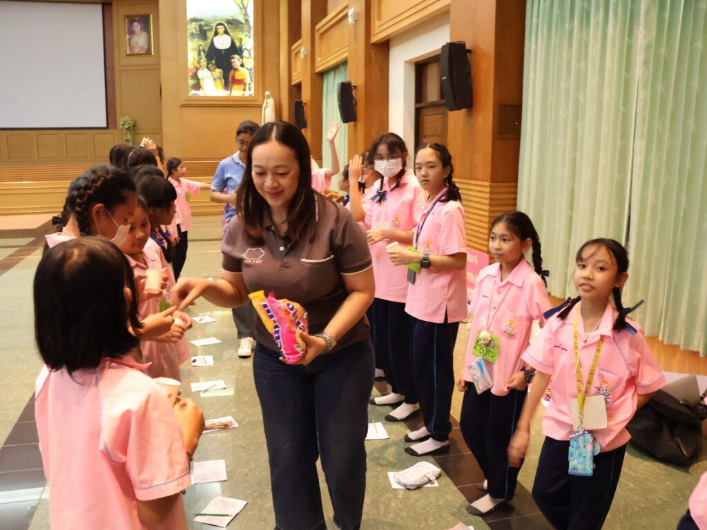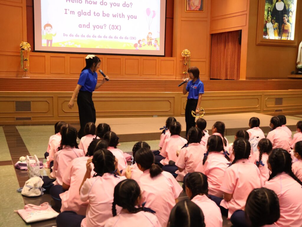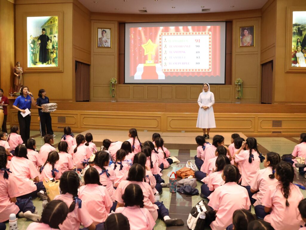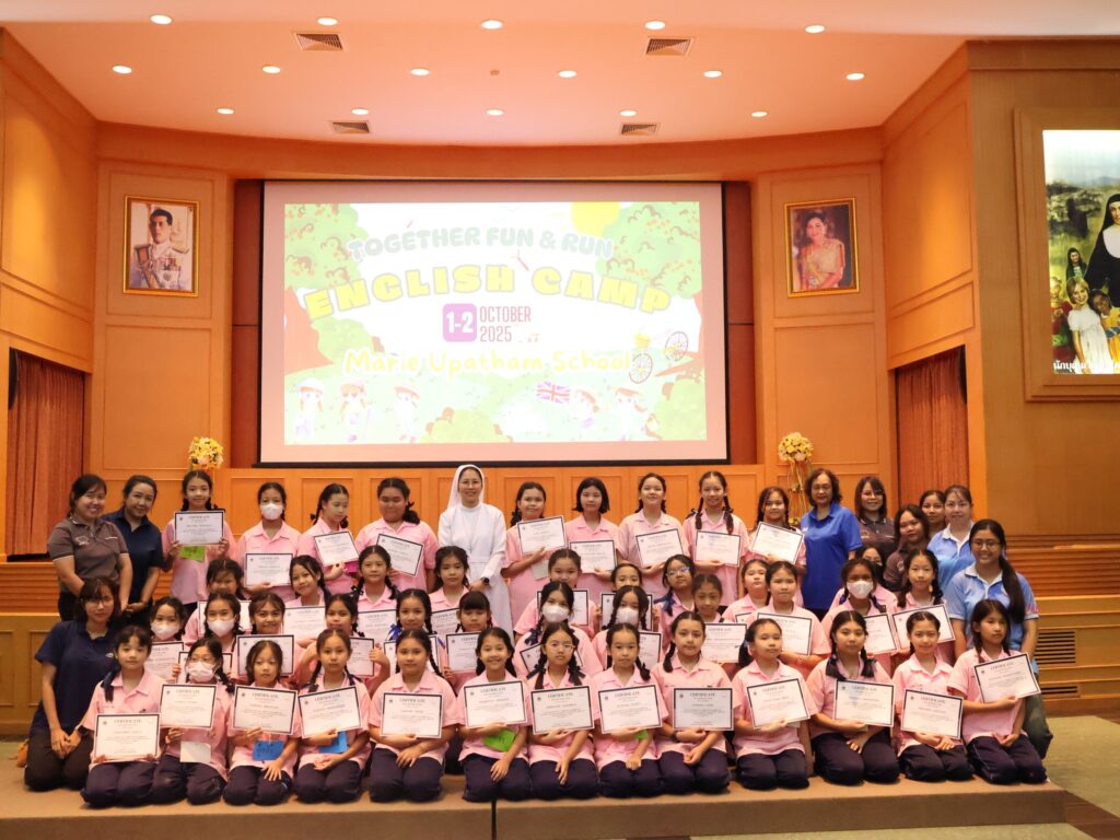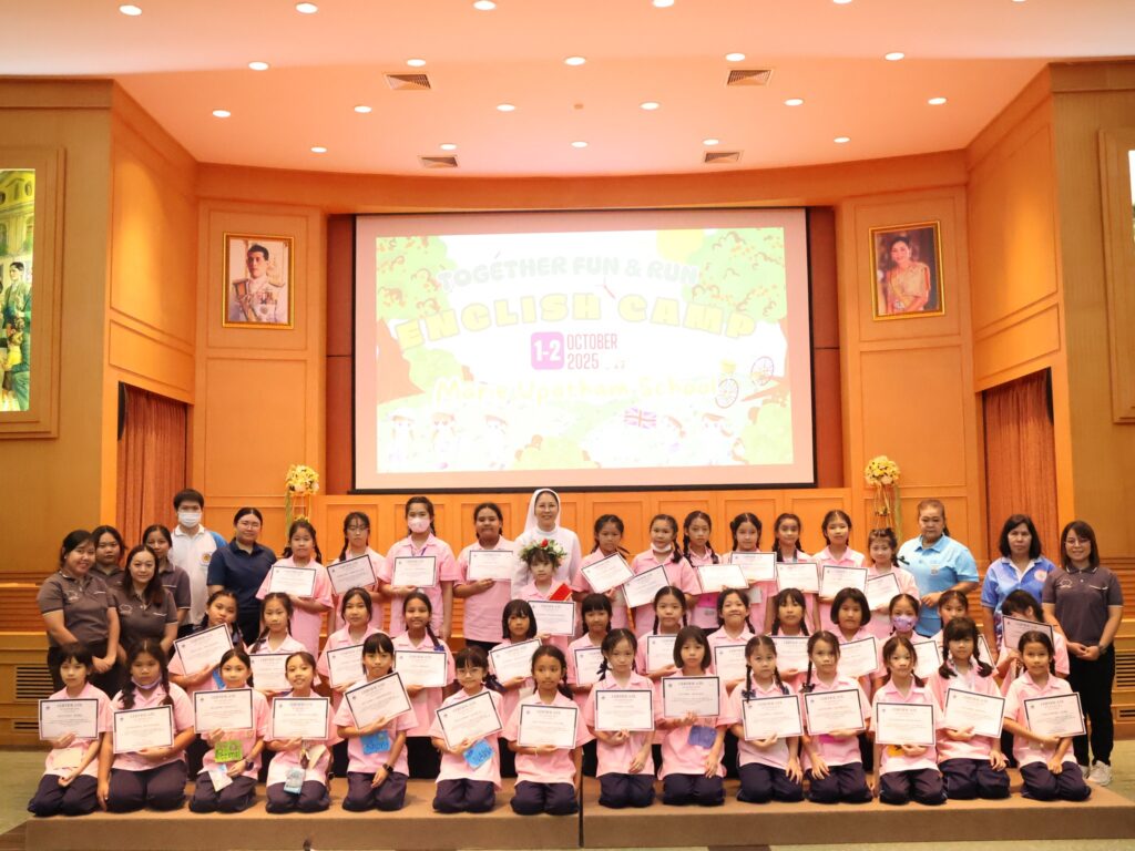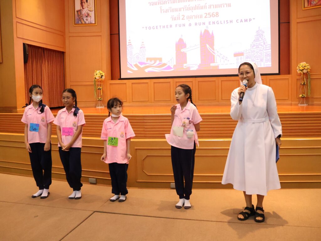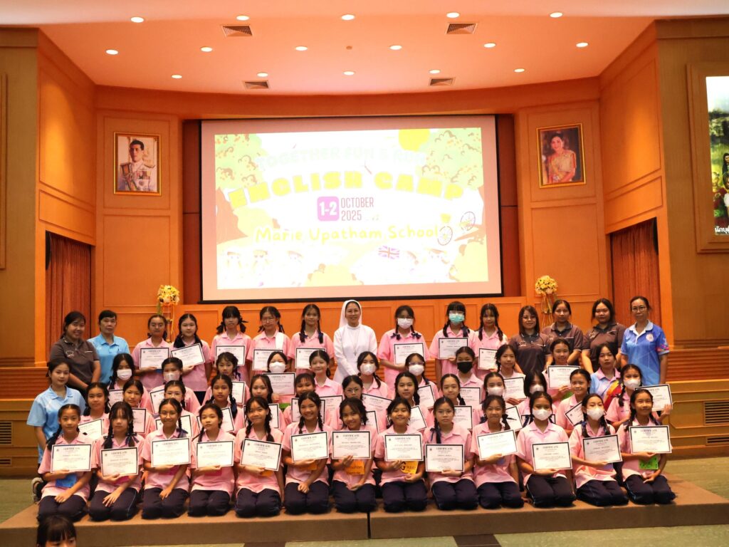 วันที่ 2 ตุลาคม 2568 กลุ่มสาระการเรียนรู้ภาษาต่างประเทศ โรงเรียนมารีย์อุปถัมภ์ ได้จัดกิจกรรมค่ายภาษาอังกฤษสำหรับนักเรียนระดับชั้นประถมศึกษาปีที่ 4–6 ณ บ้านธารพระพร อำเภอสามพราน โดยมีคุณครูจากบริษัท Make a Wit มาร่วมจัดกิจกรรม พร้อมด้วยคุณครูประจำชั้นและครูผู้ช่วยคอยดูแลอย่างใกล้ชิด มีนักเรียนเข้าร่วมทั้งสิ้น 129 คน กิจกรรมเริ่มต้นด้วยการภาวนาและรับฟังข้อคิดจากซิสเตอร์กาญจนา เดชาเลิศ ที่ได้ฝากข้อคิดเพื่อเป็นแรงบันดาลใจแก่นักเรียน ได้แก่