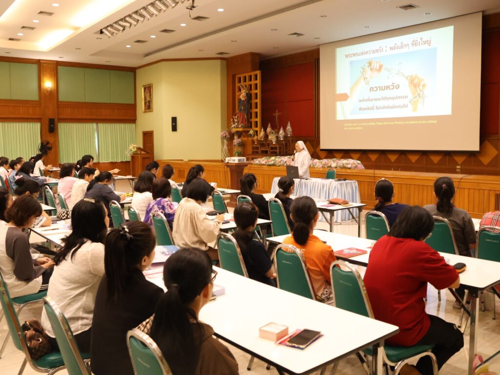“พระพรแห่งความหวัง : พลังเล็ก ๆ ที่ยิ่งใหญ่” (ความหวัง พลังที่เอาชนะได้ทุกอุปสรรค) ซิสเตอร์ได้กล่าวให้กำลังใจแก่คณะครูถึงพลังแห่งความหวัง ที่แม้มองไม่เห็น แต่สามารถขับเคลื่อนหัวใจให้ก้าวผ่านทุกอุปสรรคได้ พร้อมกันนี้ หัวหน้าฝ่ายต่าง ๆ ได้ชี้แจงแนวปฏิบัติและข้อตกลงร่วมกัน เพื่อเตรียมความพร้อมในการดำเนินงานในภาคเรียนที่ 2 อย่างมีประสิทธิภาพ ![]()